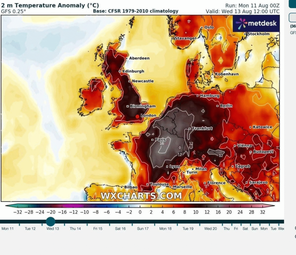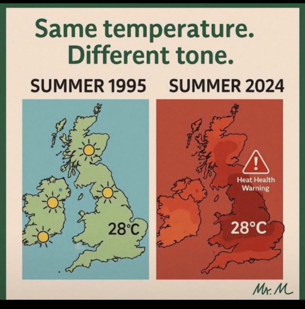 De volgende slide, slide 5, had opnieuw 2 screenshots. “Hier moet ik geen tekening bij maken zeker? Graag verwijs ik naar de briljante post van Rik Torfs op X “Als u nu nog niet door de hitte bent gestorven, komt dat omdat u te weinig kranten leest.” Eigenlijk hoeft deze slide geen verdere uitleg. Jullie kunnen zelf wel zien wat de verschillen zijn in de kleuren tussen 1995 en 2024. En die kleuren op de andere foto. Mannekes lief, het lijkt wel alsof we aangekomen zijn in de darkroom van Connor Rousseau. Snappen jullie dan niet dat de mensen deze apocalyptische berichtgeving kotsbeu zijn? De jongeren kunnen jullie vermoedelijk nog wel indoctrineren, maar als ik terugdenk aan de “horrorzomer” van 1976, dan herinner ik me enkel veel amusement, en ik heb mijn ouders er altijd met veel plezier over horen praten. Omdat ik er geen tijd voor heb, en ook geen zin eigenlijk, wil ik hier niet verder over uitweiden, want er zijn talloze wetenschappelijke publicaties die de klimaatangst compleet onderuit halen, maar dat mag blijkbaar nooit aan bod komen bij jullie.”