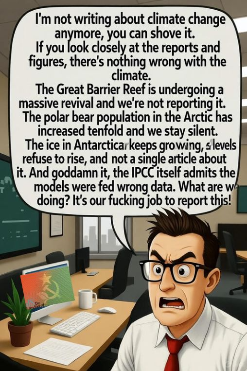 De stilte die daarop volgde had ook via de zender een ongemakkelijk karakter. “Moet ik het er uit sleuren?” kwam het wat geërgerd. Waarop de eerste stem zei: “Ik schrijf niets meer over het klimaat, je kan me wat. Als je goed naar de rapporten en de cijfers kijkt, is er helemaal niets mis met het klimaat. Het Great Barrier Reef is aan een gigantische revival toe, en wij schrijven dat niet. De populatie ijsberen op de noordpool is vertienvoudigd en wij blijven stil. Het ijs op Antarctica blijft maar groeien, de zeespiegel wil maar niet stijgen en geen enkel artikel daarover. En godverdomme het IPCC geeft zelf toe dat de modellen met verkeerde data gevoed werden. Waar zijn we mee bezig? Het is onze fucking job om dat te melden!” De stilte werd nog dieper. Je hoorde zacht schuifelen. En toen kraste de stem van Verhoeven: “Ik wil jou binnen vijf minuten in mijn kantoor zien.” Zijn stem klonk koud en hard.