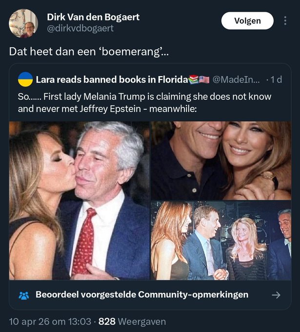 “Dat heet dan een boemerang” schreef Van den Bogaert bij de zogenaamde ‘gelekte’ foto’s van Melania in de armen van Epstein.